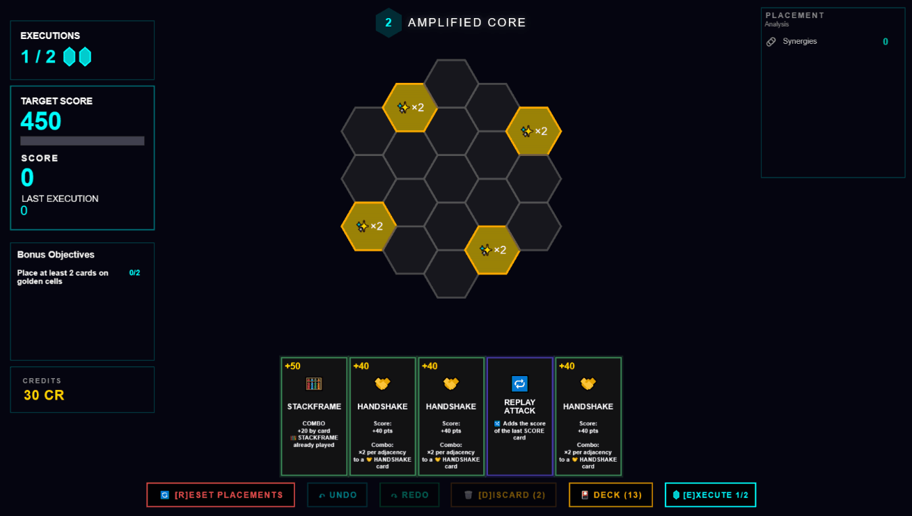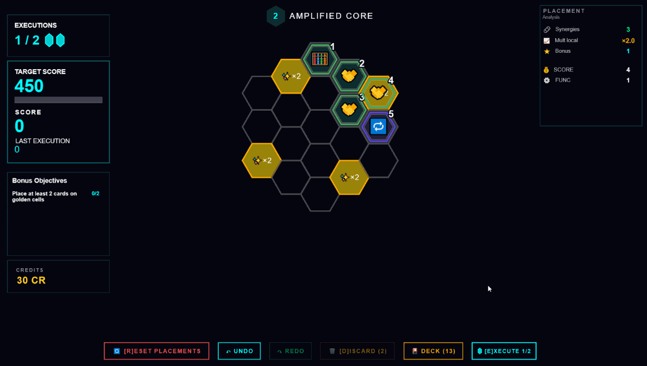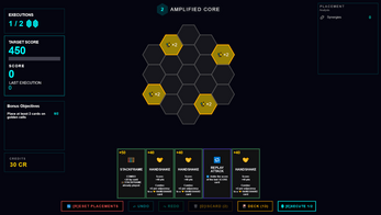 A roguelite deck-builder meets puzzle game. Place cards on a hexagonal grid, trigger chain reactions, and build the ultimate combo deck.